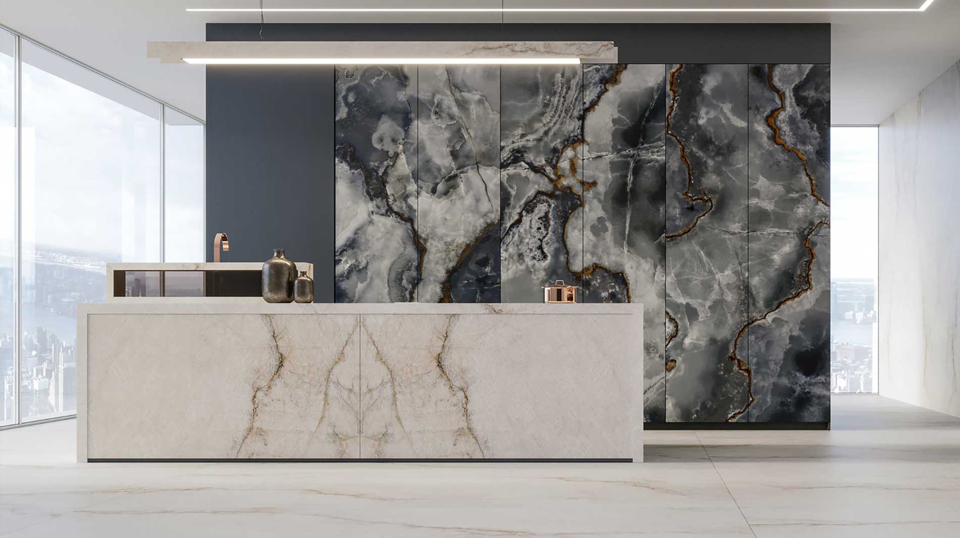 • Tile: Large-format (120x120cm or larger) polished or lappato (semi-polished) porcelain.